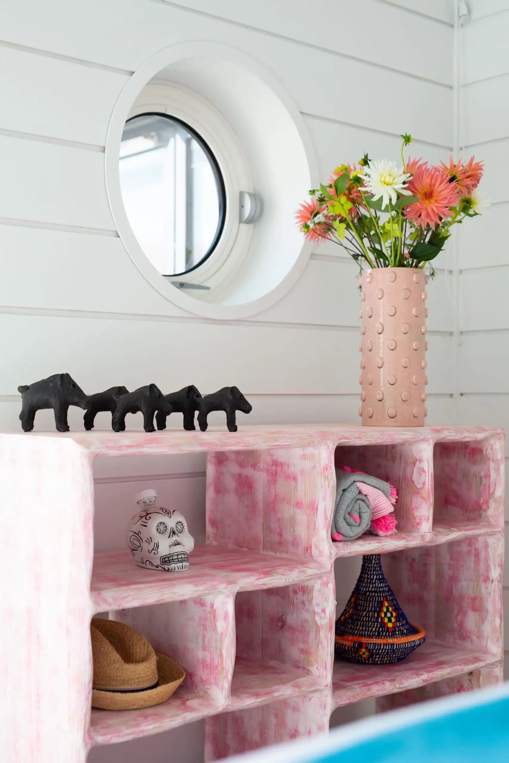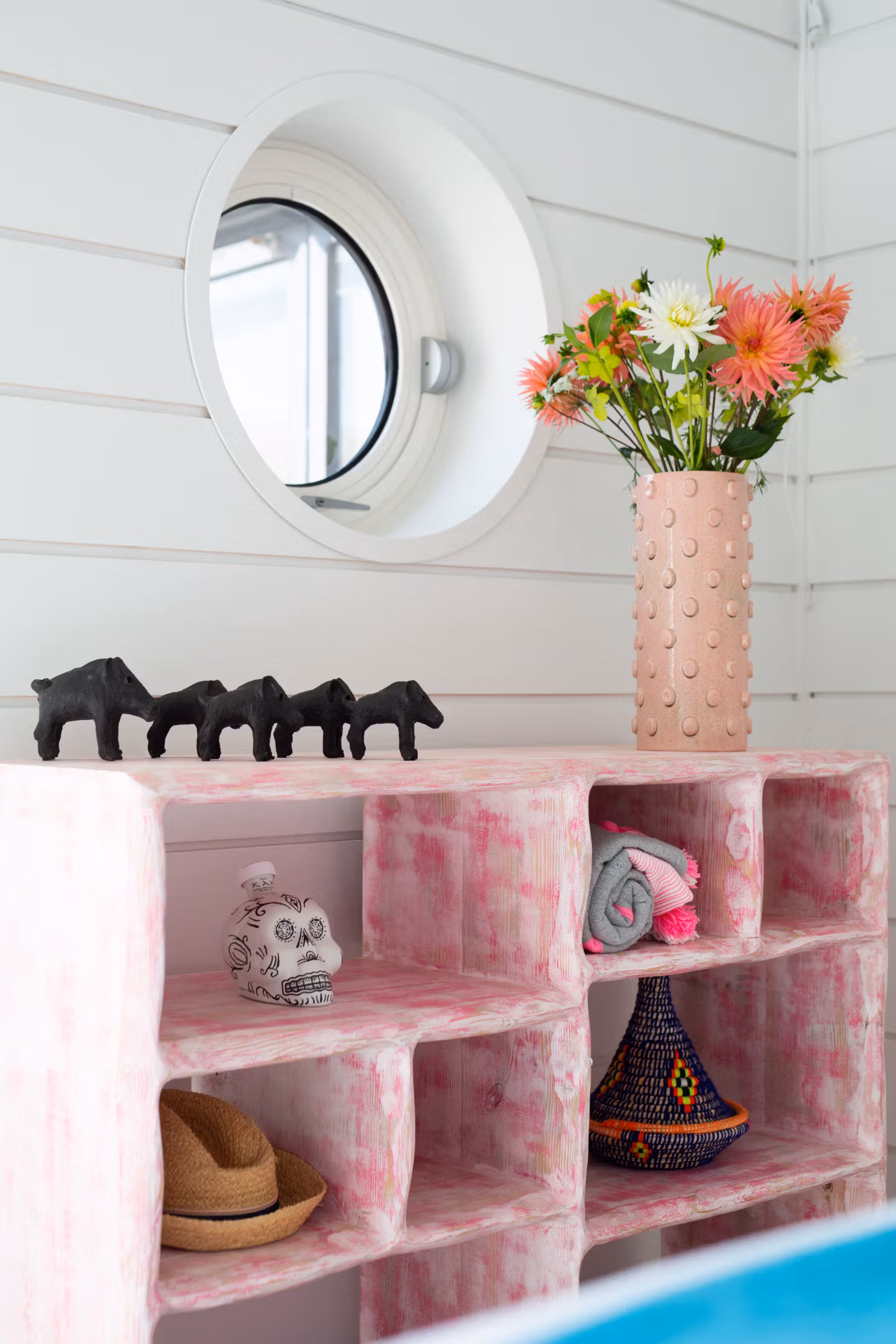 Then, my mind went to India and Morocco and the colours and craft that blow my mind there – those joyful turquoises and vibrant pinks, intricate detailing and myriad textures. I have brought flashes of that into each house which zing brilliantly against the white shiplap walls.