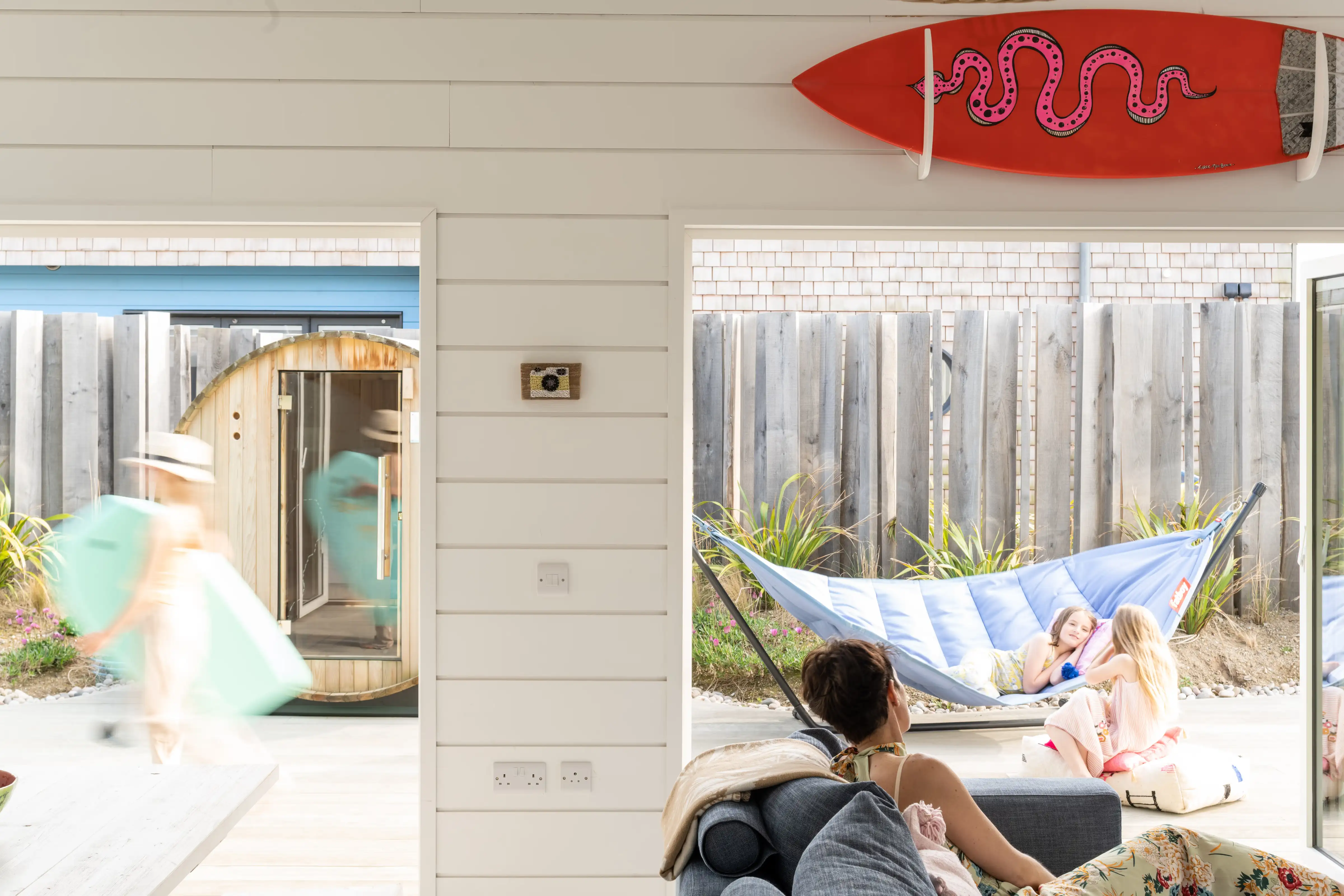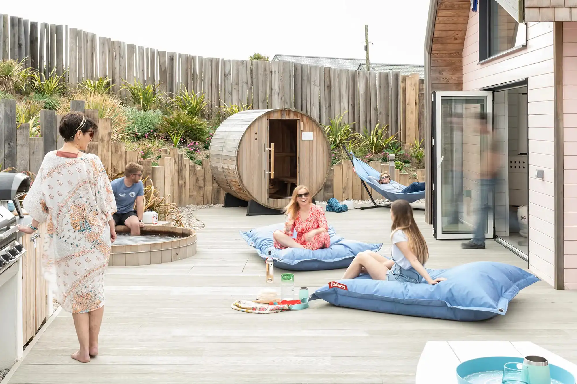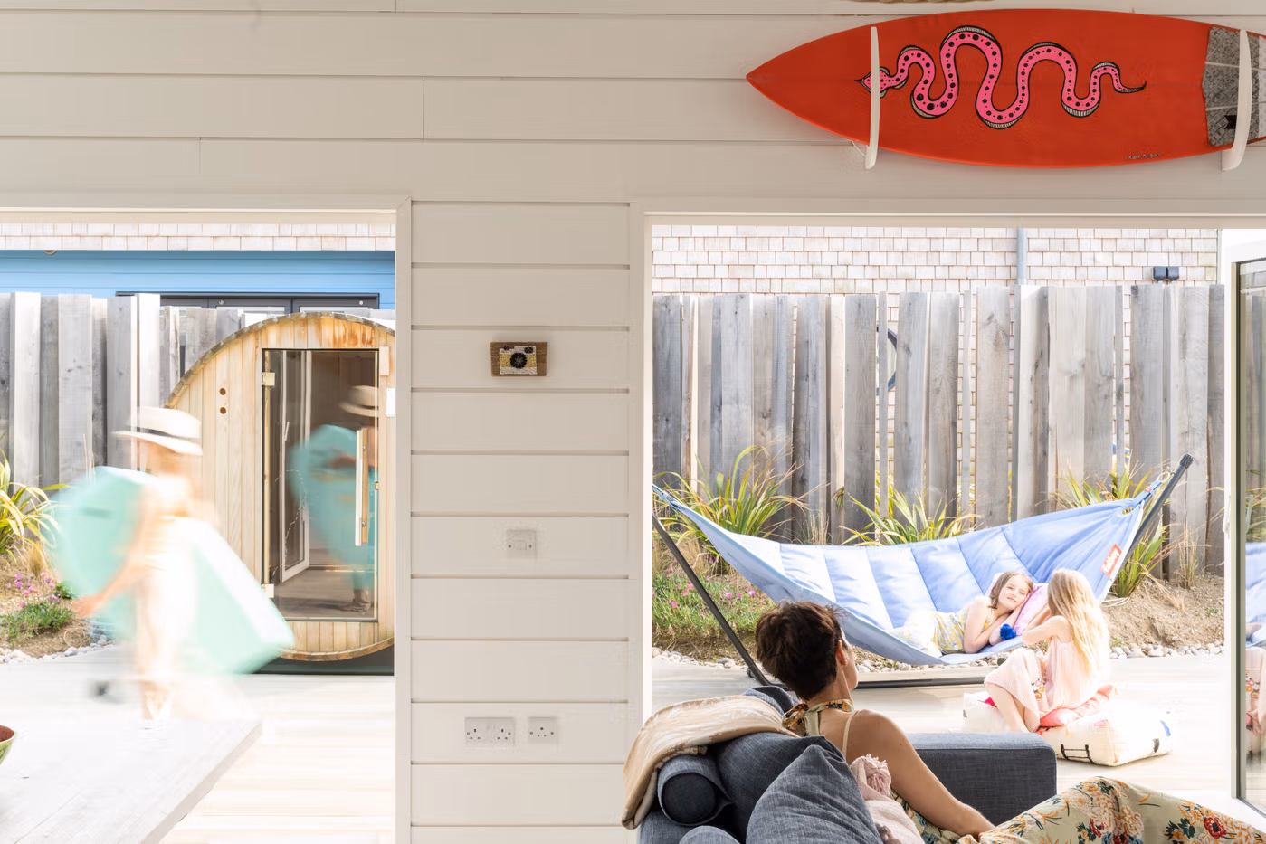 Sets of patio doors open out on to a large private decking areas with 6ft sunken cedar hot tub, barrel sauna, hot and cold outdoor showers, surf rack, Aussie BBQ, outdoor dining tables, bean bags and hammocks.