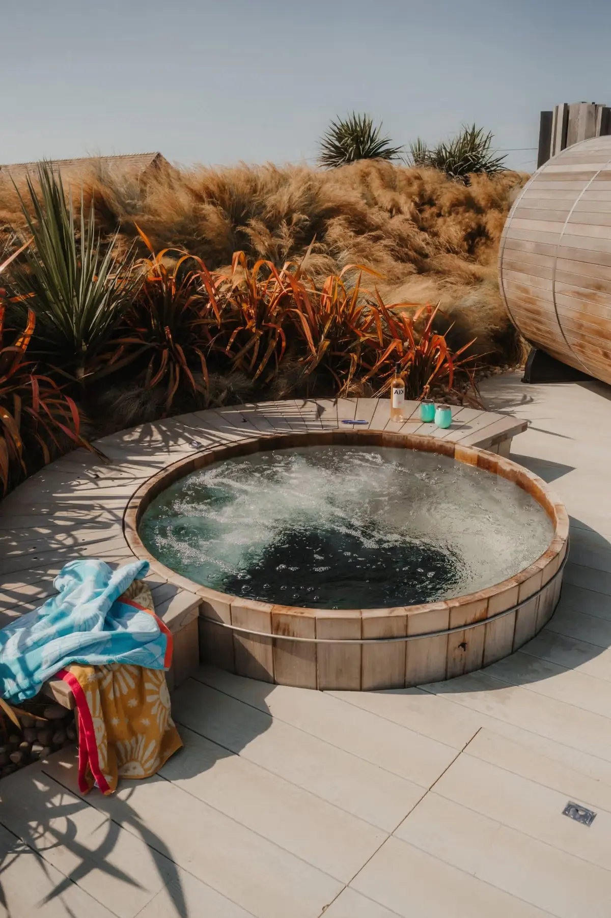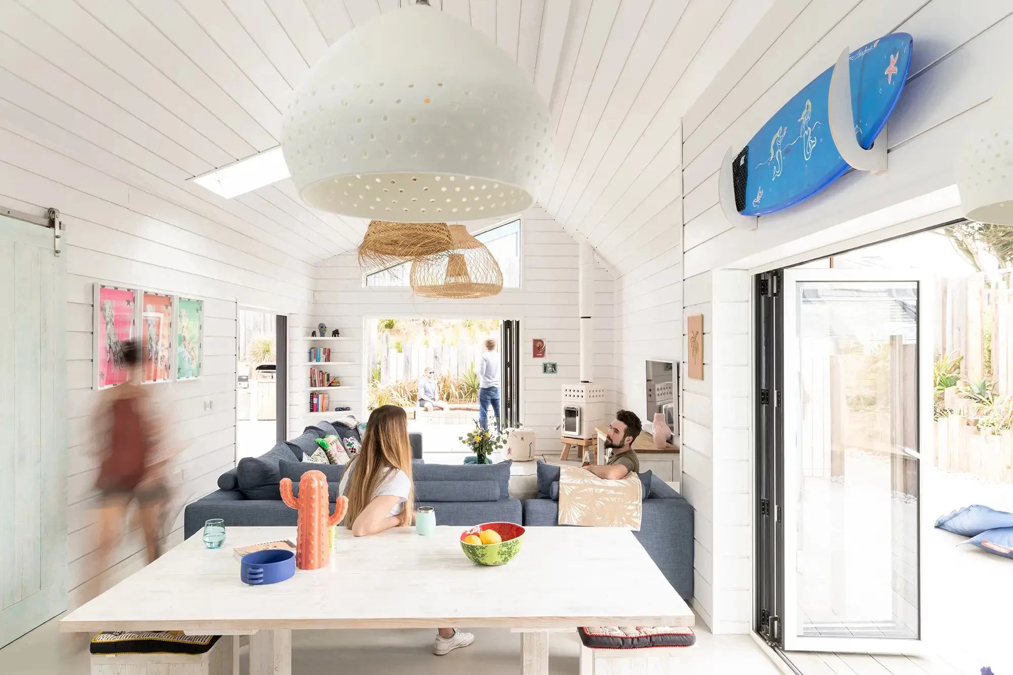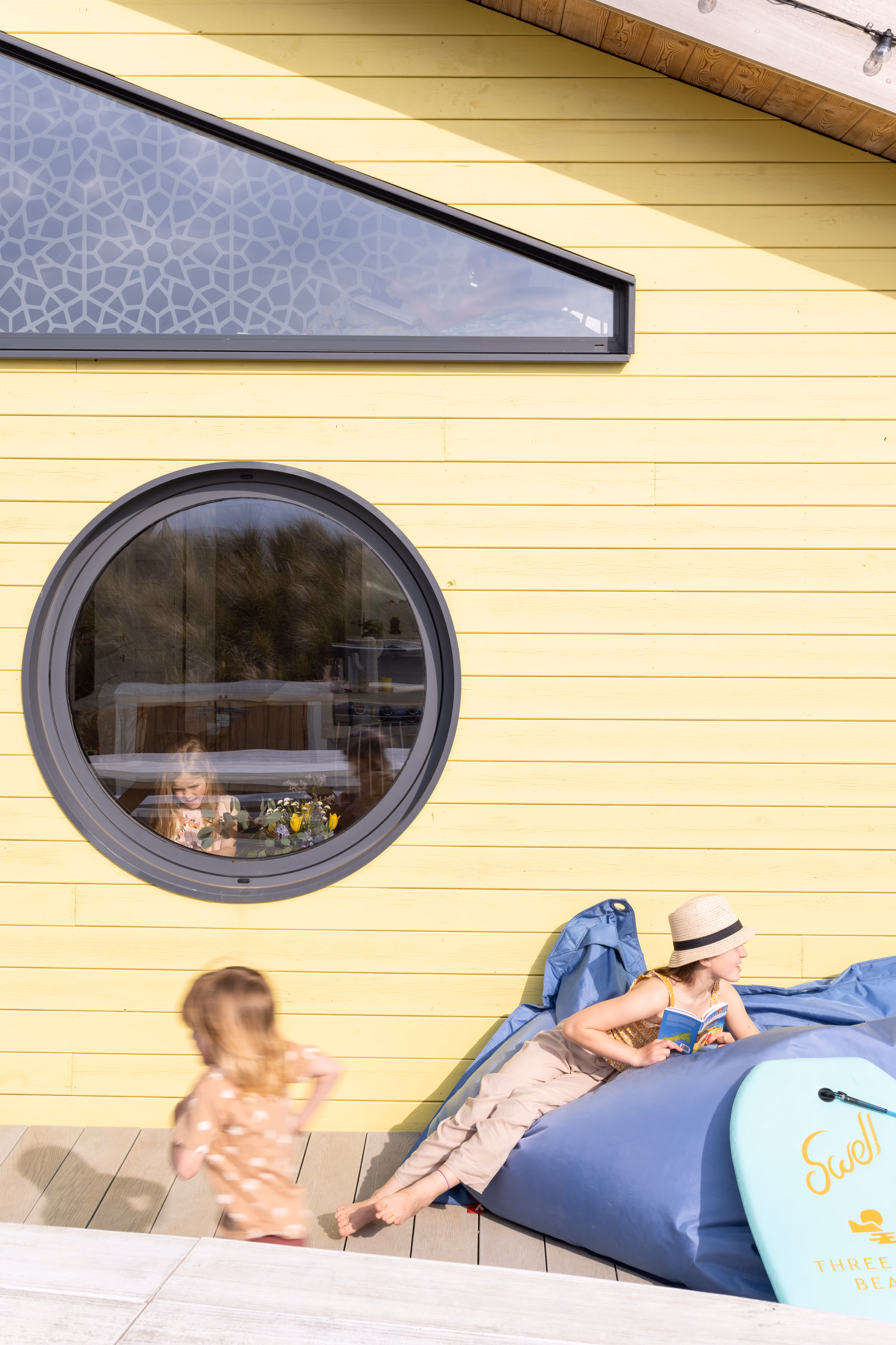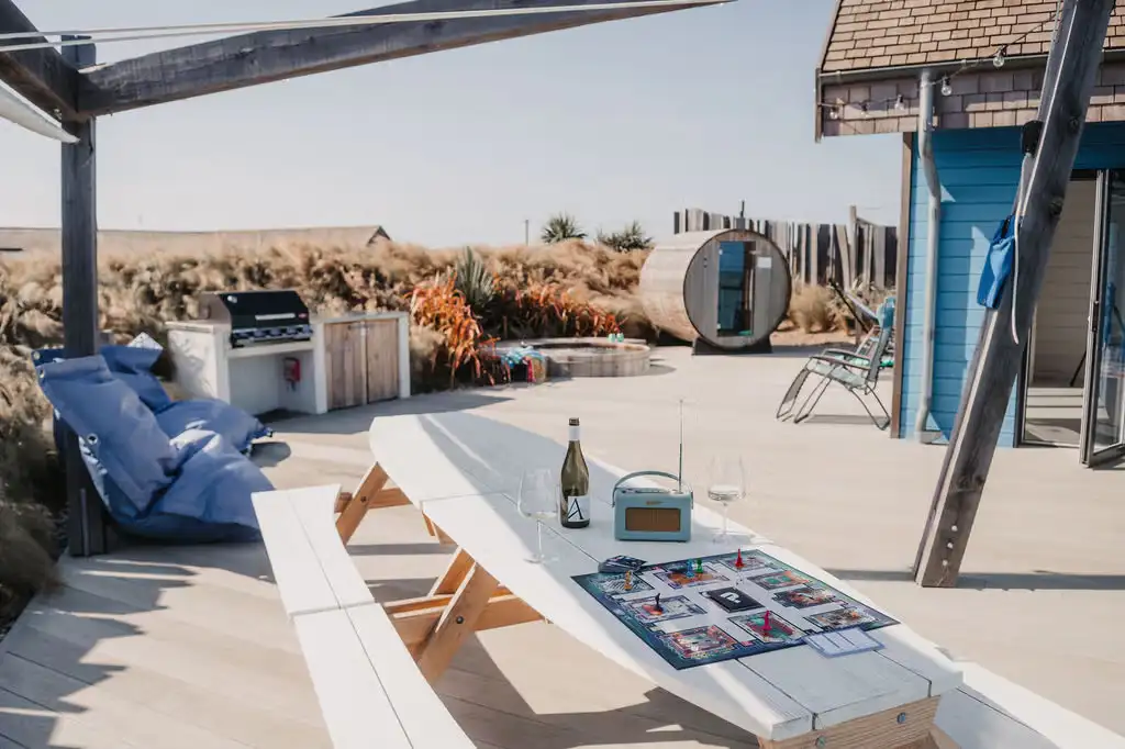 Sets of patio doors open out on to a large private decking areas with 6ft sunken cedar hot tub, barrel sauna, hot and cold outdoor showers, surf rack, Aussie BBQ, outdoor dining tables, bean bags and hammocks.
